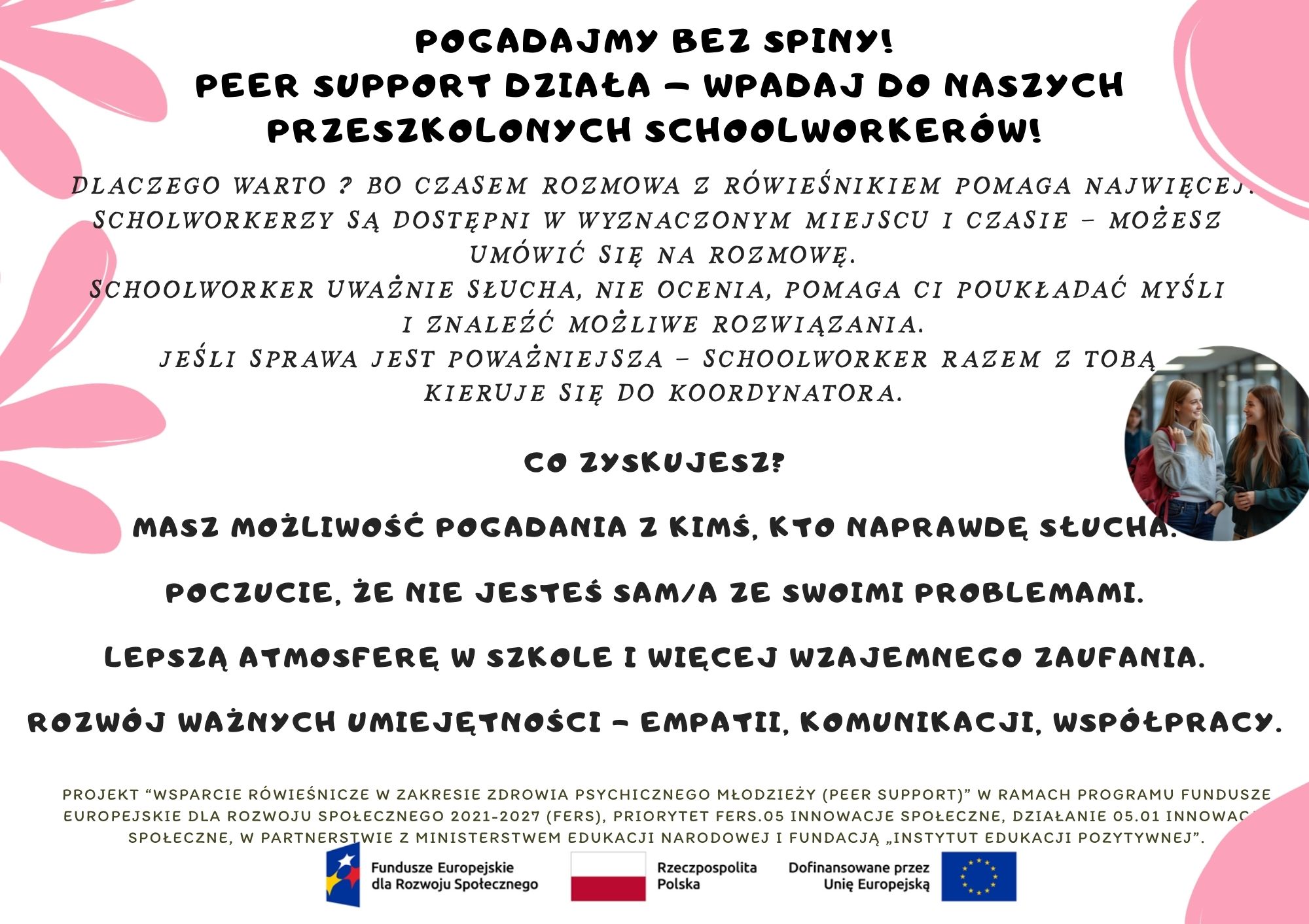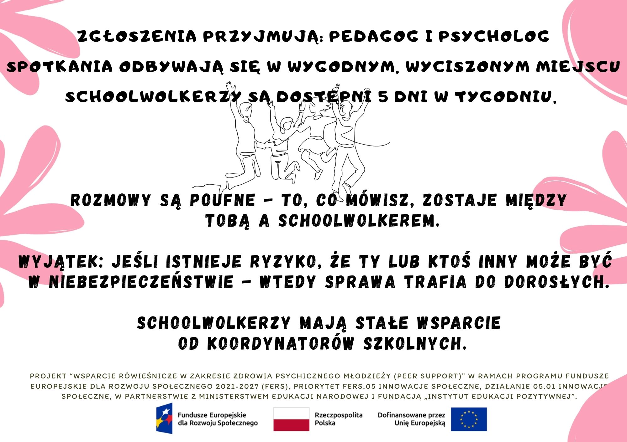 Projekt “Wsparcie rówieśnicze w zakresie zdrowia psychicznego młodzieży (peer support)” w ramach programu Fundusze Europejskie dla Rozwoju Społecznego 2021-2027 (FERS), Priorytet FERS.05 Innowacje społeczne, Działanie 05.01 Innowacje społeczne, w partnerstwie z Ministerstwem Edukacji Narodowej i Fundacją „Instytut Edukacji Pozytywnej”.