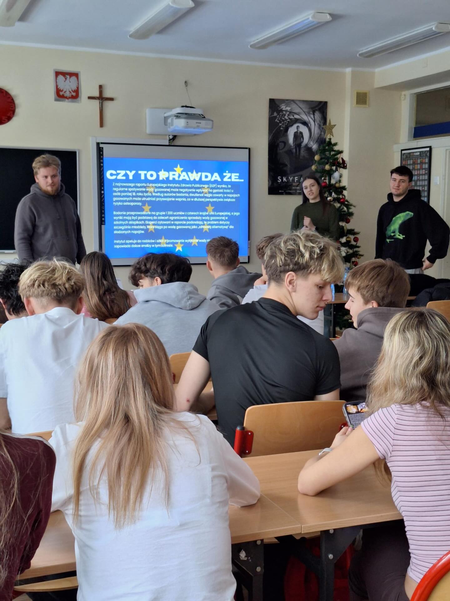 Jagoda, Kacper i Kacper w ciekawy i przystępny sposób przybliżyli zagadnienia związane z odpowiedzialnym korzystaniem z mediów, zwracając szczególną uwagę na konieczność weryfikowania informacji pojawiających się zarówno w tradycyjnych mediach, jak i w mediach społecznościowych.